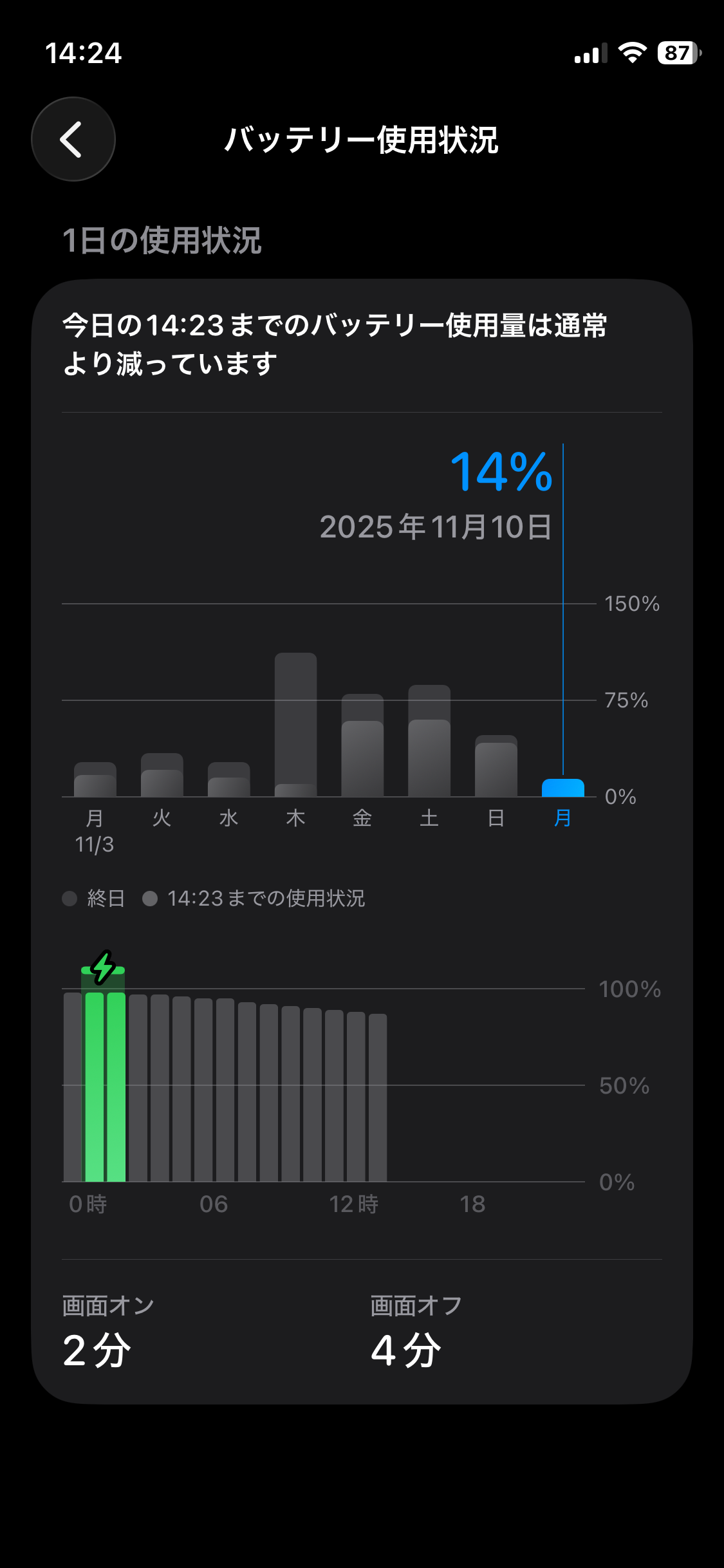 実際の減り方ですが・・・セルスタンバイでキープ何もしない状態では、12時間ほどで100%→87%と13%ほど減少。交換前は12時間で75%表示まで減っていたので、容量アップ分を実感できる感じです。