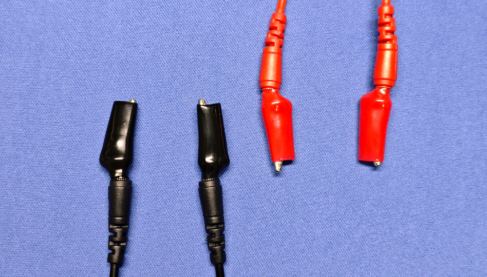 ワニ口クリップで固定できるのも便利そう。なぜワニ口のアタッチメントは各色2セットあるかと思ったら、ケーブルの両端にコレを装着すれば、単なるワニ口が両端のケーブルに変化できるわけですな。案外考えられたセットなようです。