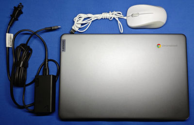 2015年に買っていた ASUS の Chromebook はとっくに OS のアプデ対象から外れて使い物にならなかったので、古い PC の Flex OS とか入れて Chrome OS を楽しんだりしていたけど、やっぱり専用品が1台あってもイイかな、と思いポチリ。中古品なので箱などは無く、段ボール内はプチプチで保護されて、純正な電源アダプタと、謎な ELECOM の有線マウスがオマケとして付属していました。