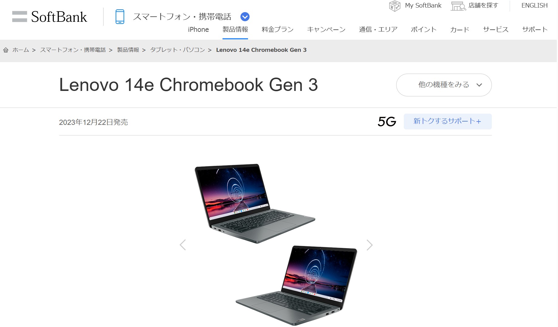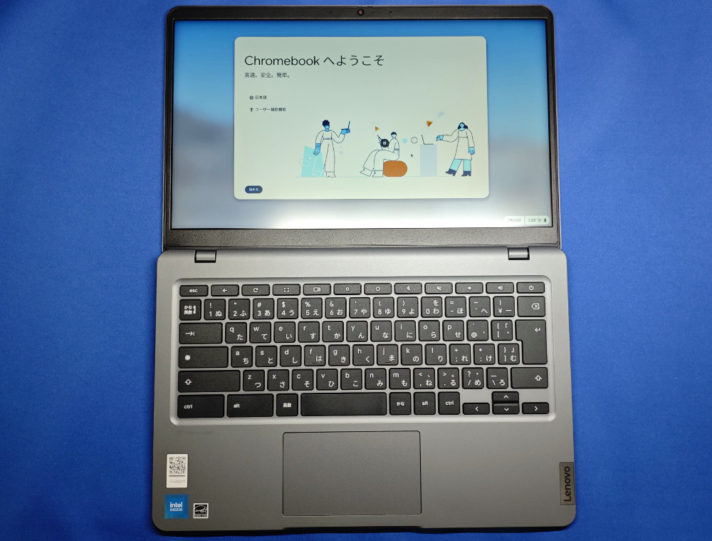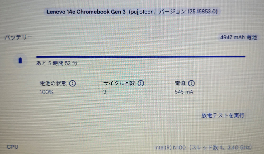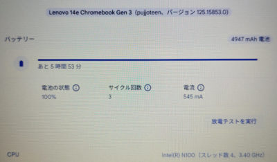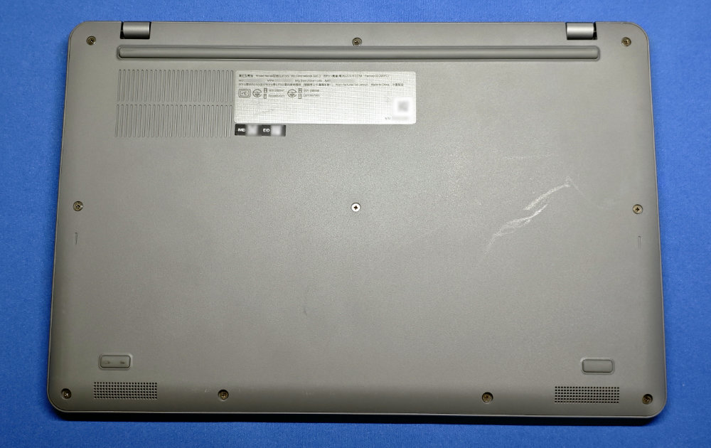 この Chromebook には色々な SKU があって時折ナカミの更新もあるっぽくて、最新の Lenovo 版は N200 搭載で 8GB/128GB、IPS 液晶らしいけど、入手したのは 5G モデム入りの Softbank 版っぽい。N100 で 4GB RAM、eMMC 64GB と最新版より若干非力ながら、Chrome OS ならそれほど困ることはないかな。