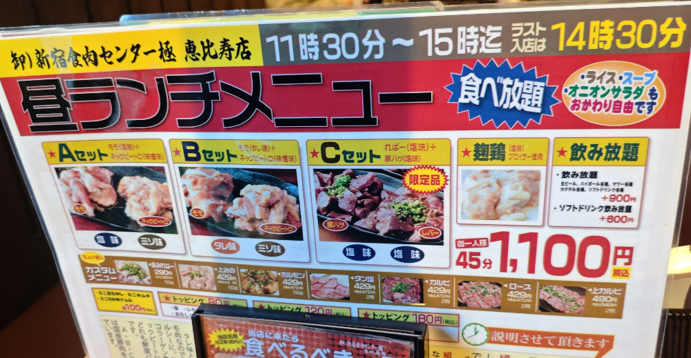 卸) 新宿食肉センター極 恵比寿店では、昼ランチとして1,100円で食べ放題をやっているそうな。興味本位でトライです♪ 時間は45分と短めで、豚と鶏から選ぶ感じですが・・・1,100円とはなかなかの安さです。スタートは2種類乗ったセットの3択で、ライス、スープ、オニオンサラダが自動的に出てくるそうな。その後の追加オーダーはタブレット使って個別に行う感じ。