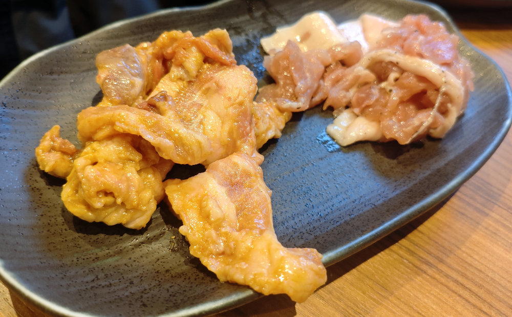ワタシのスタートはAセット。モモの塩味とネックピートロのミソ味。Bセットだとモモがタレ味になります。