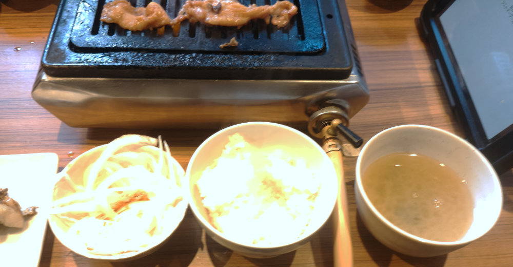 セットのオニオンサラダ、ライス、味噌汁。窓際だったせいか、撮影が白飛びしちゃった。ライスはべっちょりしててちょっと残念。味噌汁も冷えてる。オニオンサラダは、お肉と合わせて食べると割とイイ感じ。まぁ、これらはオマケな感じですな。お代わり自由だそうな。