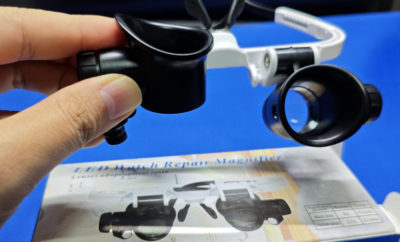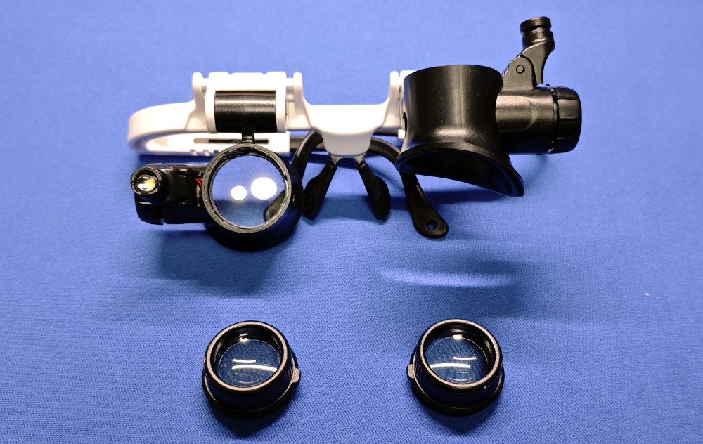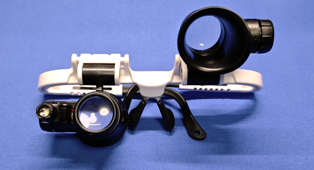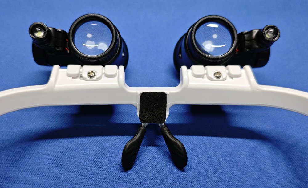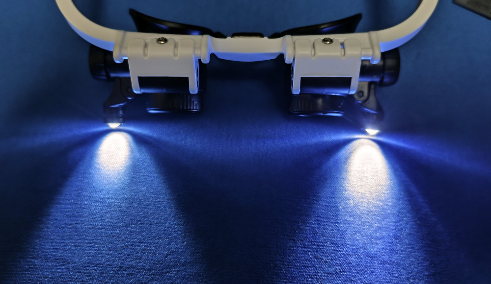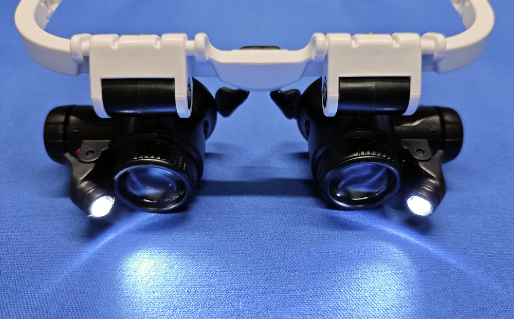 両眼のレンズ横に LED ライトが付いてまして、これで頭を近づけて対象が影になって見にくい・・・というコトにはならなさそうなのも良さそうだな、と思ったトコロ。ライトの向きも微調整できます。