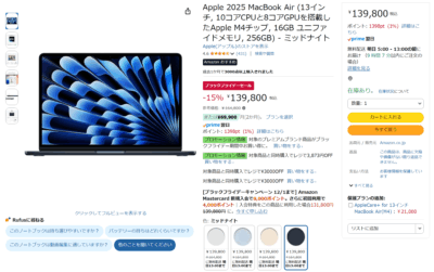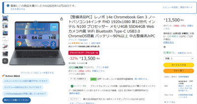 などと考えていましたが、セール前半で Chromebook を入手してしまったので、やっぱり今回は Mac は見送りにします。ポイント大量還元だったワタシが購入した後に値上がりしていた(ポイント付与が普通になった)けど、11/30の昼過ぎでは表示価格が下がった上に10% オフクーポンが出ていて、少し手を出しやすい価格になっています。