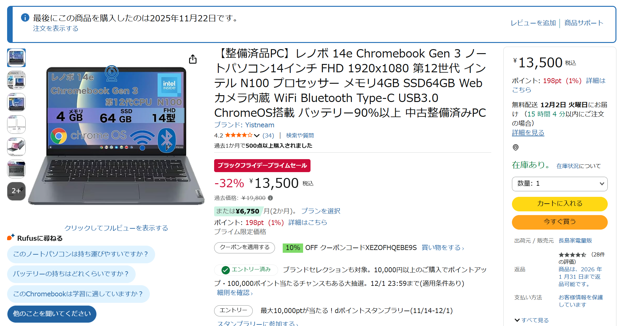 まぁ、ブラックフライデーの後はサイバーマンデー(12/1)が待っているし、もう少ししたらクリスマスだ年末セールだと、色々安くなるタイミングもあるでしょう。そうか・・・Amazon のセールはサイバーマンデーまで包括しているんですな(笑)。