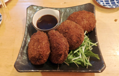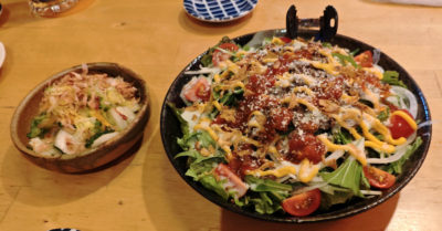 飲み放題付きのコースは4800円。クーポン利用で飲み放題は 2.5h に延長してあるのがポイント♪ ゴーヤと白菜の漬物と、シーザーサラダ。仕事と緊急事態で2人不参加で4人での忘年会ですが・・・結構ボリューミー。シーザーサラダはタコスっぽい味付けでかなりウマイ。