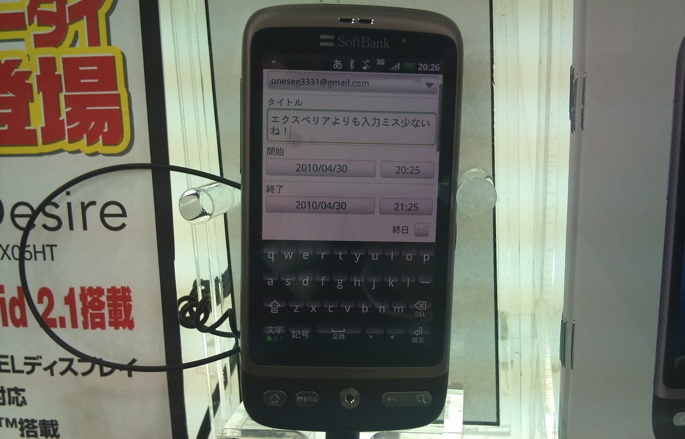 そしてこれは我慢ならないのが文字入力・・・というよりタッチパネルの精度。Xperia は良く A と S をご認識したり、右下にあるボタンをなかなか認識しなかったり不満が多いのですが、Desire はほぼ問題なく入力可能。画面サイズは Xperia の 4.0 インチの方が微妙に大きいはずなのですが、Desire での文字入力ではミスなく入力できる・・・。この点だけはなんとか改善をソニエリにお願いしたい!!