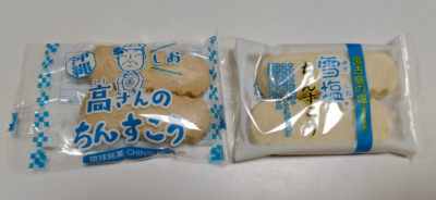 帰りの空港でゲットした雪塩ちんすこうと比較します。手前の2個が激安品。右側は包装紙があるだけで、ナカミは左側と同じ。コチラは実家への置き土産にしました。