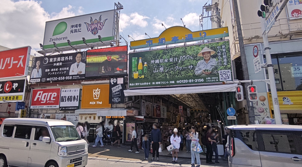 沖映通りと国際通りが交差するポイントにある市場本通りの中を散策します。夜にも来ていますが、最終日はフライトまで時間タップリあるので暇つぶしです。