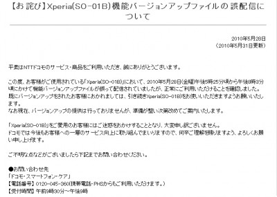 Posted in Gadgets Xperia のフライングは本物だった!! Author: 管理人 Published Date: 2010/06/01 Leave a Comment on Xperia のフライングは本物だった!! 既に各所でニュースになっていますが、先日の Xperia のファームアップデートは、誤配信ながら正式版と相成りました♪ まぁ・・・なんかドコモのお詫びが速すぎるような気がしてなりませんが・・・わざと先行配信したんじゃないかと勘ぐってしまいます。 期待できるのは、以前は「6月中旬」と言っていた配信時期が「準備が整い次第」に♪ 早めの配信・・・期待しております!! Author: 管理人