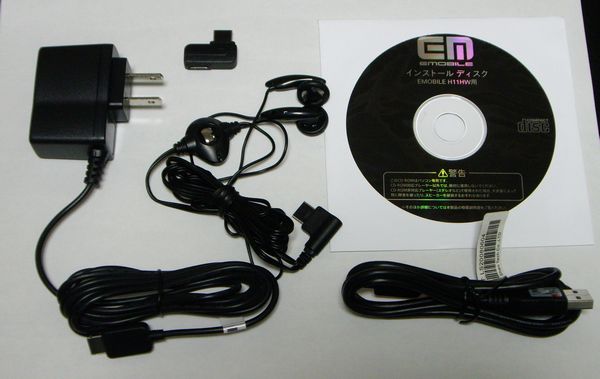 付属品はこんな感じ。充電器にヘッドセット、携帯用の平型プラグへの変換コネクタ、USBケーブル、CDROM。このほかに説明書2冊と数枚の補足説明の紙きれがありました。
