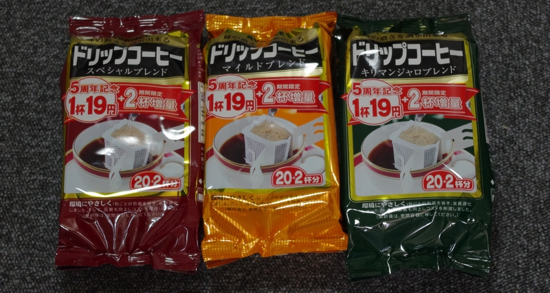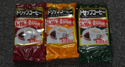 で、ネットで探すと色々あるのですね・・・安いのが。上の写真のヤツは7月半ばに楽天のとあるショップで購入したもの。3種類が2つずつ、合計132杯分で送料込み2,500円。まだ半分ほど残っています。