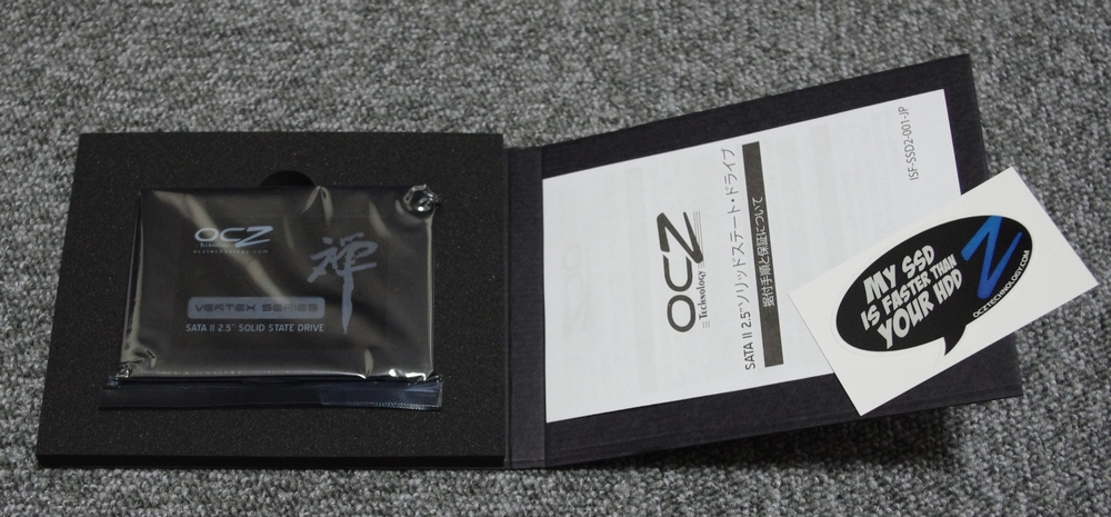 なんか格安(9,980円)という値段につられて、それほど必要としてもいない SSD を買ってしまいました。「OCZ Vertex 禅 (OCZSSD2-1VTXZ60G)」です。OCZ のページには商品情報は無いのですが、多分コレの日本向けパッケージ。