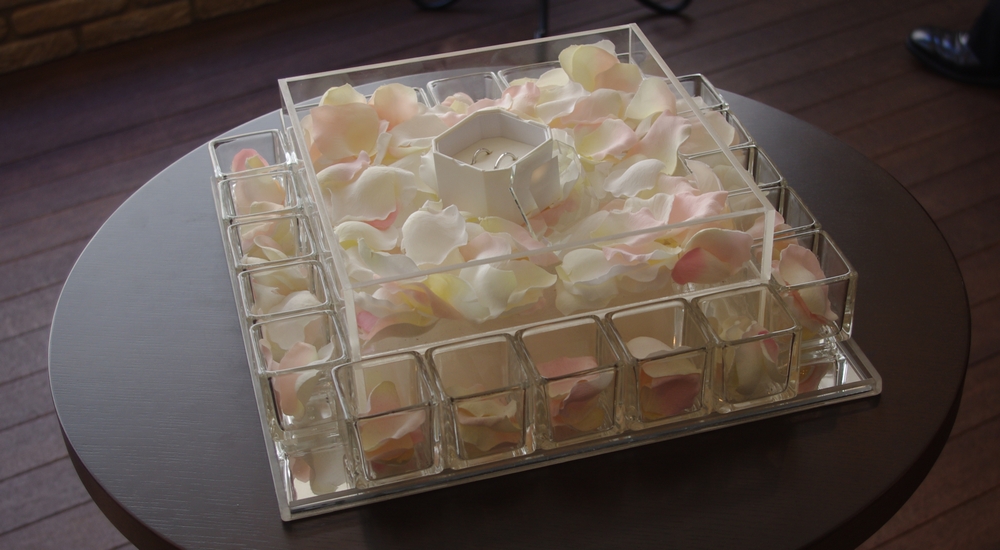 少々休んでから9Fのチャペルへ。入り口には二人のリングが飾られていました。なかなかキレイな演出です♪