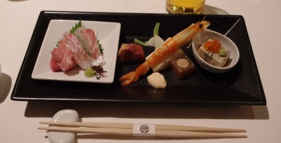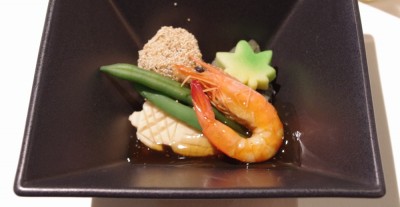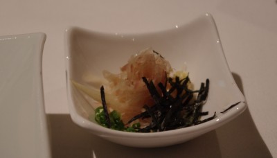 前菜は紅白造里、雲龍豆腐、いくら、熨斗海老、蟹餡平酒盗クリーム、フォアグラ大根、合鴨燻製、カブ浅漬。海老の味が絶妙で美味しかったなぁ・・・造里の紅は大トロ。これもとろけて美味しかったです。