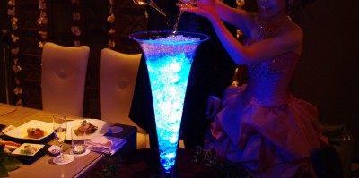お色直しした新婦と、新郎が各テーブルのグラスに水を注ぐと、青い光が灯ります。最後は高砂の巨大なグラスに。キャンドルサービスの代わりですが、暑い夏にはぴったりの涼しげな演出です。