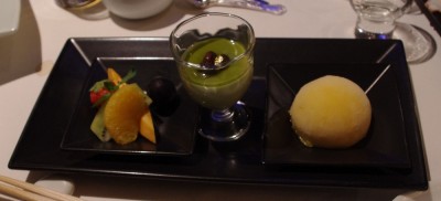 デザートは季節の氷菓子と季節のフルーツ、抹茶豆腐。抹茶豆腐はクリーミーできっと美味しいのだろうけど、既に味音痴状態・・・