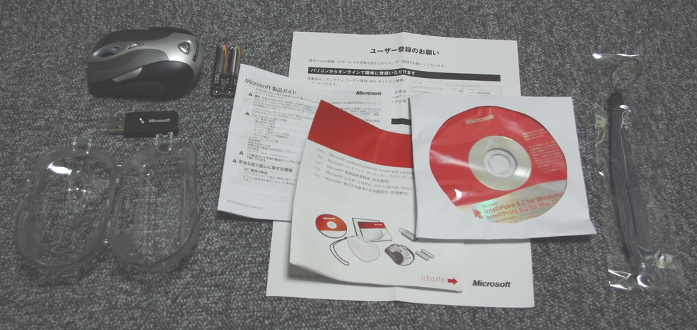持ち運びを考えて、ちゃんとストラップも付いております。IntelliPoint が入った CDROM も付属。IntelliPoint をインストールすれば、通常のマウスとしてだけでなく、PowerPoint の操作もできちゃいます。