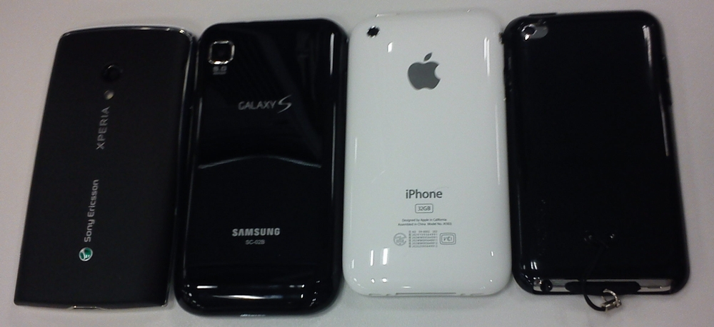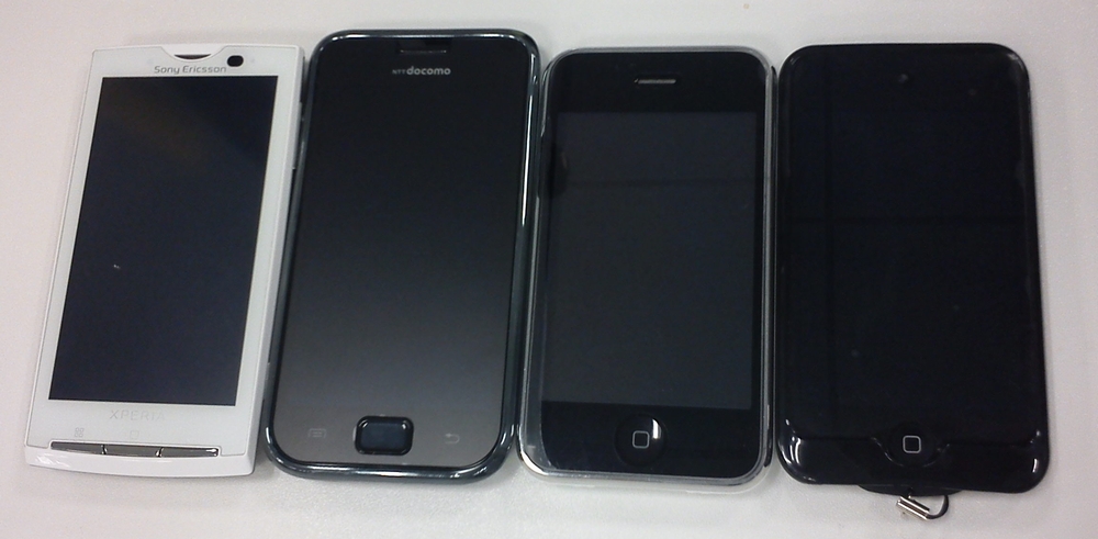左から私の Xperia X10、Y栗氏の Galaxy S、H田氏の iPhone 3GS、E本氏の iPod Touch 最新モデル。iPod だけカバー付きです。銀河S は iPhone 3GS とデザインが似すぎ。他の人は「Y栗君、iPhone 買ったんだ♪」って本気で言ってました(笑)。