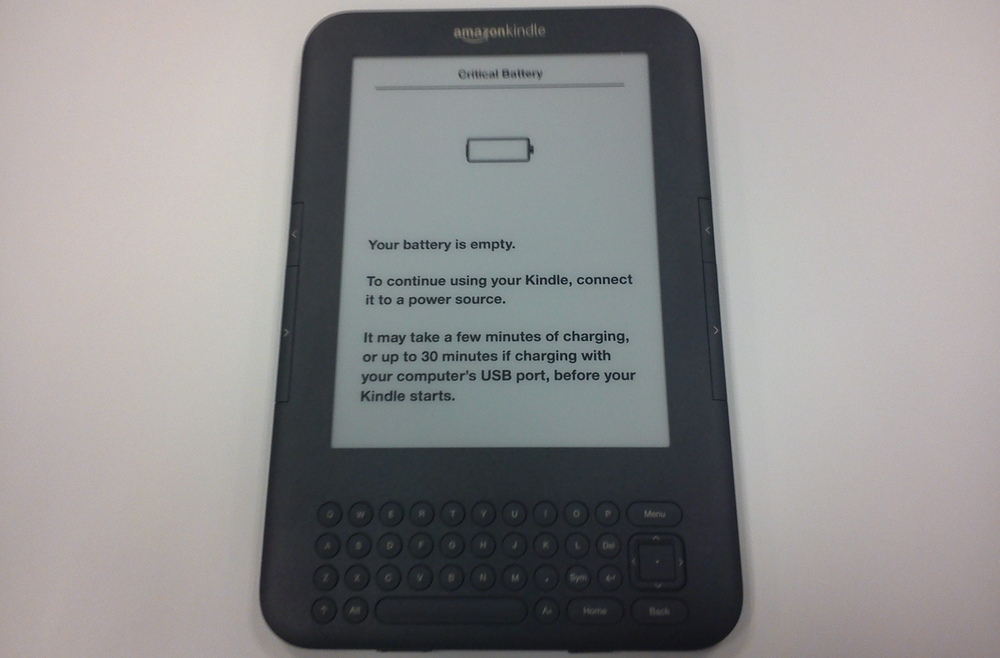 さて、10/9 に我が家に来日してから、ヘビーに使っているわけではないけど時折英語の BOOK (サンプル)を読んでいたAmazon Kindle ですが、開封直後に充電して以来まるで紙の本のように使っておりました。すると・・・