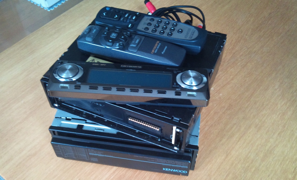 取り外した2台のカーステ。いずれも完全動作せずなジャンク状態。電源が入らなくなってしまった Pioneer の DEH-P919 は CDRW を中に含んだままだったのですが、色々と改造して通電までできるようにしてなんとか取り出せました。この魔改造の状態でも音楽が聴けたので、買い換えなくても良かったかも・・・