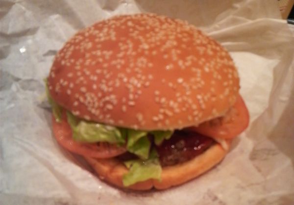 はい。結構巨大です♪ レタスにトマトがタップリ。パティも量が多くておなかいっぱいになれます。しかし、なんかパティの味というか肉っぽい風味はちょっと薄め・・・かな?