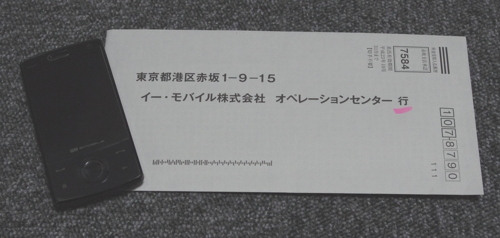 2年前に購入した HTC Touch Diamond。この blog の初期はこの Diamond ネタが多かったのですが、昨今の Android + bmobile 運用のためすっかりイーモバイルを使わない状態になっておりました。「新にねん」が先月の10月に終了し、11月中の解約であれば違約金が発生しない状態でした。
