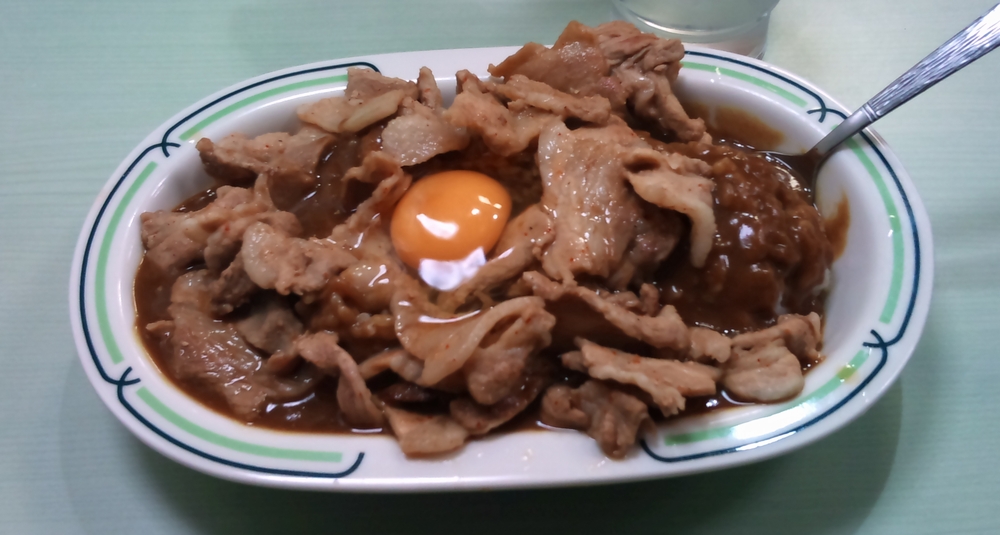 これが頼んでから出てくるまで非常に速い!! で、お味はカレーは甘口ではないけど辛くはない(私の個人的な感想で、同行者の一人は辛いと言ってました♪)。しかし、味は深みがあって意外にウマイ。生卵も相性抜群。豚肉は結構厚みもあって「そんなにいらないんじゃ・・・」と後半思ってしまうほど。ご飯の量も多いですが、カレーのルーが不足することなく、ちゃんとキレイになくなるようになっていたのには感心しました。