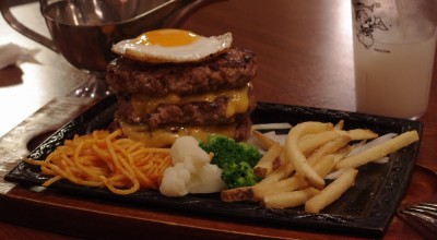 A氏はツリーバーグプレート。3枚のハンバーグが今にも倒れそうな状態に重ねられています。ていうか、お姉さんが持ってきたとき倒れかけました(笑)。