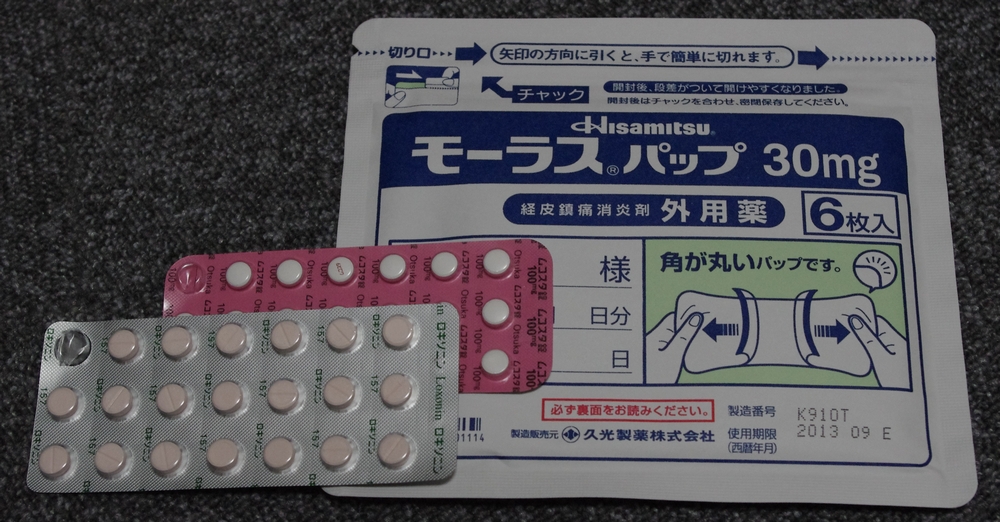 今回処方されたのはロキソニン(痛み止め)1週間分。胃が荒れるのでムコスタを添えて・・・そしてモーラスパップ。病院の帰りにちょっとご飯を食べて、早速ロキソニンとムコスタを飲みました(第一三共と大塚の飲み合わせ♪)。1時間ほどでだいぶ楽になりました。ああ・・・これなら仕事もできるかも♪