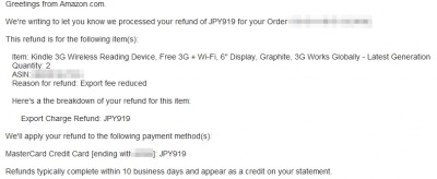 Posted in Gadgets, Shopping Amazon から返金!? Author: 管理人 Published Date: 2010/12/11 Leave a Comment on Amazon から返金!? Amazon からなにやらメールがやってきました。それも .com の方から。その内容は・・・ どうやら、以前購入した Kindle の配送手数料が改変されて、安くなったのでその分を返却しますってな内容です。919円ほどクレカ経由で返金してくれるそうです。 過去の買い物にまで遡って値引きを適用するとは、なんとも太っ腹・・・というか、メンドクサイ会社ですな(笑)。 共同購入したY栗氏と分け合います。忘年会のビール1杯分位・・・かな!? Author: 管理人