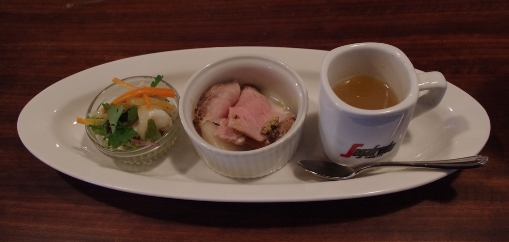 前菜は「タコのマリネ」「湘南豚の自家製生ハム」「地鶏とクスクスのスープ」。タコは歯ごたえ十分で美味しい。湘南豚も独特な風味(甘み)があり、柔らかくて美味。スープは・・・予想とはちょっと違った味で思ったより薄味。