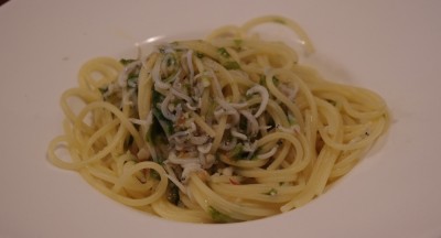 パスタ1品目は「釜揚げしらすと生海苔のスパゲティーニ」。2種類選んだので、それほど量は多くないです。一口目はぷわーっと磯の香りが口の中に広がりました。和風な味付けかと思いきや、ガーリックも結構効いてて不思議なバランス。しかし、パスタがちょっと緩めなような・・・