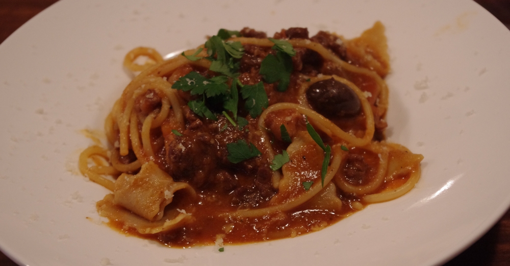 パスタ2種類目は「猪のラグー(ミートソース)のスパゲティ」。猪肉が結構ゴロっと入ったミートソースと、生パスタ、オリーブが入っていました。生パスタはモチモチで美味しい。猪も臭みはなく、でも他の肉とは異なる独特のミートソースになっていました。
