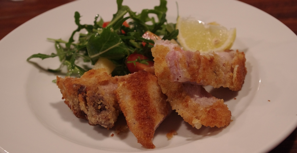 カツレツは脂身も甘くて、ボリュームもあります。衣のサクサク感も抜群。ほとんどこれといった味付けは感じられませんが、素材の旨みで勝負といった感じです。付け合せも面白く、どうにも白い根っこみたいなものがわからなかったので、シェフに伺ったところ、ヤーコンだそうです。初めて食べました。