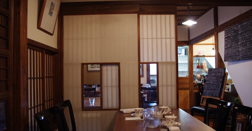 ほぼ満席で、予約必須らしいのですが、食べ終わるころには私たちだけに。店内はこんな感じで和風な古民家です。