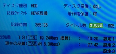 605タイトルで365時間ほどたまっています。が、TSで残り10時間分ほど残っています。どうやら、ディスク毎に割り振ることができるチャプターの総数が決まっていて、そちらの上限が先に達してしまったようです。