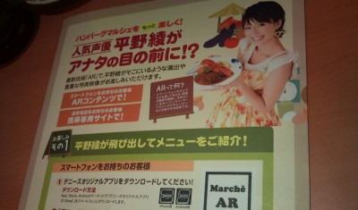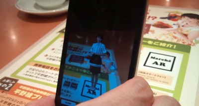 なんかこんなキャンペーンやってました。AR (拡張現実)を使ったメニュー紹介が楽しめるらしいのですが、iPhone だけでなく Android にも対応しているとのことで、遊んでみました。8MBオーバーなアプリをダウンロードして起動すると、カメラを起動して、「Marche AR」と書かれた矩形を特定の位置に持っていくと平野綾が現れるというもの。