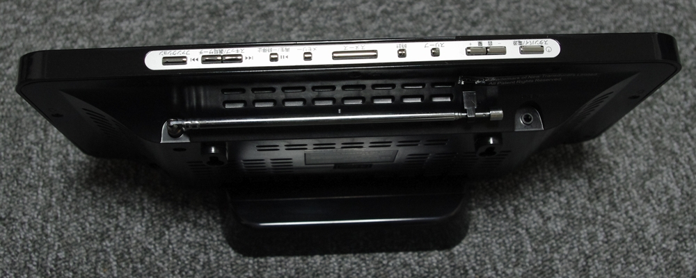 上部に操作ボタンがあります。アンテナはラジオ用です。iPod 以外にも AUX 入力ができます。