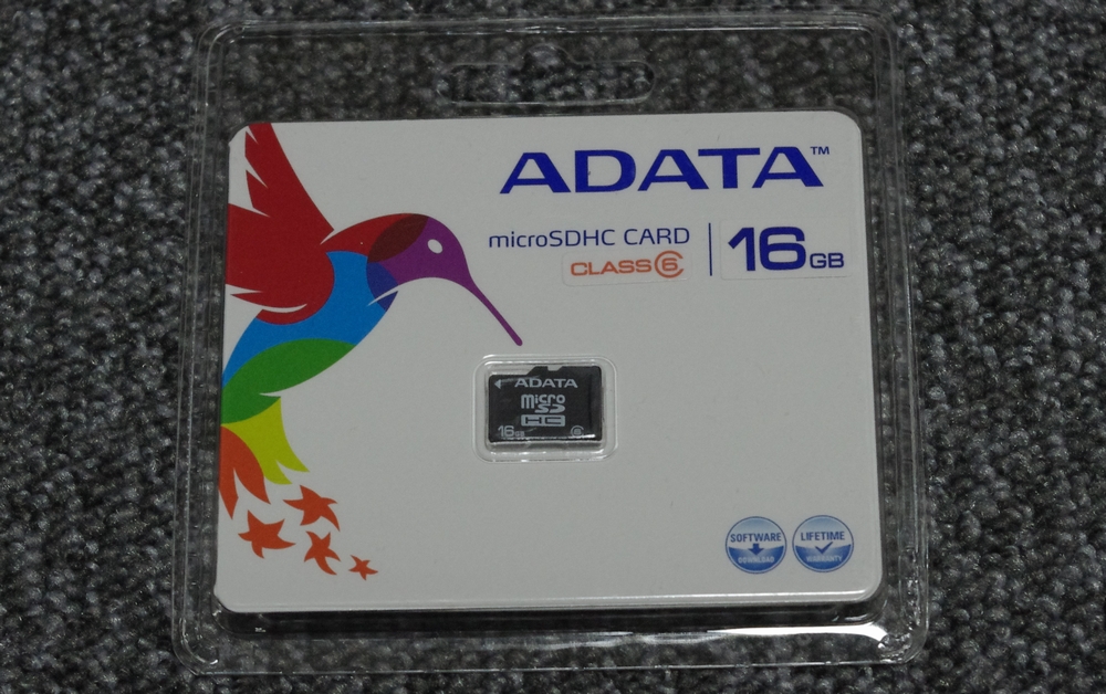 ADATA のものです。2,299円でした。Class 6 もだいぶ安くなりましたね。Class 10 のものも出回っていますが、ちょっとお値段するものが多いので、Class 6 で我慢。