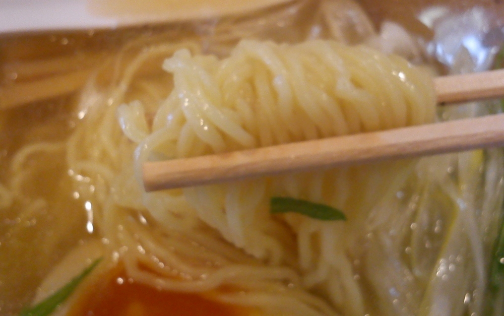 スープは非常にサッパリしております。塩加減も薄すぎず、濃すぎずな感じ。野菜(特にネギ系)の甘みが出ています。麺は細めのちじれ麺。全体的にサッパリ系。淡麗系と言われるアレです。味玉も薄味ながらちゃんと味が染みています。