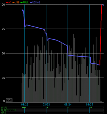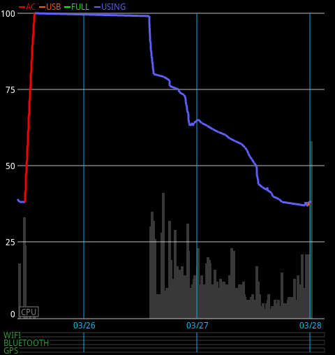 bmobile SIM U300 を入れて運用。普通に使ってみたとこと、3日は普通に持ちそうな勢いです。もちろん電源 OFF の時もほとんど漏れていませんし、これが正しい動作ということでしょう。