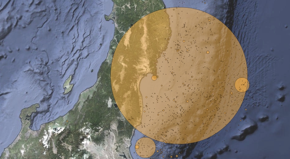 様々な情報を地図上にプロットしているのもわかりやすい。上の画像は震源地とマグニチュードを示したもの。いやはや、多発しまくっているのが一目瞭然ではないですか。