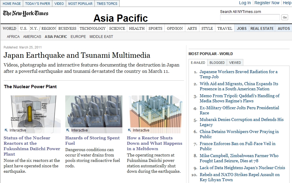The New York Times の Asia Pacific の特集ページ「Japan Earthquake and Tsunami Multimedia」がすばらしいです。