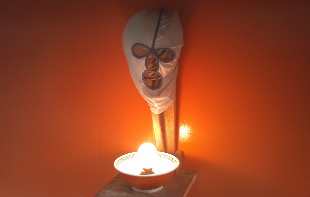 オレンジ1色の壁も目立つのですが、このマスクが南米な生首に見えなくもなし(笑)。