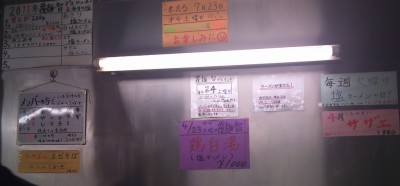 壁には会員限定のトッピングや、イベントラーメンの情報が掲示されています。食べ終わると会員証を貰える場合があり、同行の2名は貰っていました。が、私には「まぜそばは300からだから・・・」と言ってもらえませんでした。どうやら、「まぜそば食うなら麺300gの大盛りを食ってからじゃないと会員資格はねーんだよ・・・」ということらしい。夜の部は会員限定らしいので、ちょっと残念。
