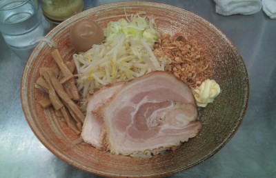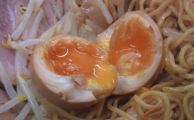 味玉を割ると、半熟トロトロ。そして味が結構染みていてこれはウマイ!! 全体的には、スープが無いので、各具材と麺をダイレクトに楽しむ感じです。他のものを頼んだ人によると、スープは醤油系で少ししょっぱい感じらしいですが、美味しそうでしたね。