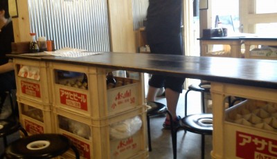 店内はこんな感じ。トタンな壁に、ビールケースで作ったテーブル。安っぽい丸椅子というなんともレトロな感じです。