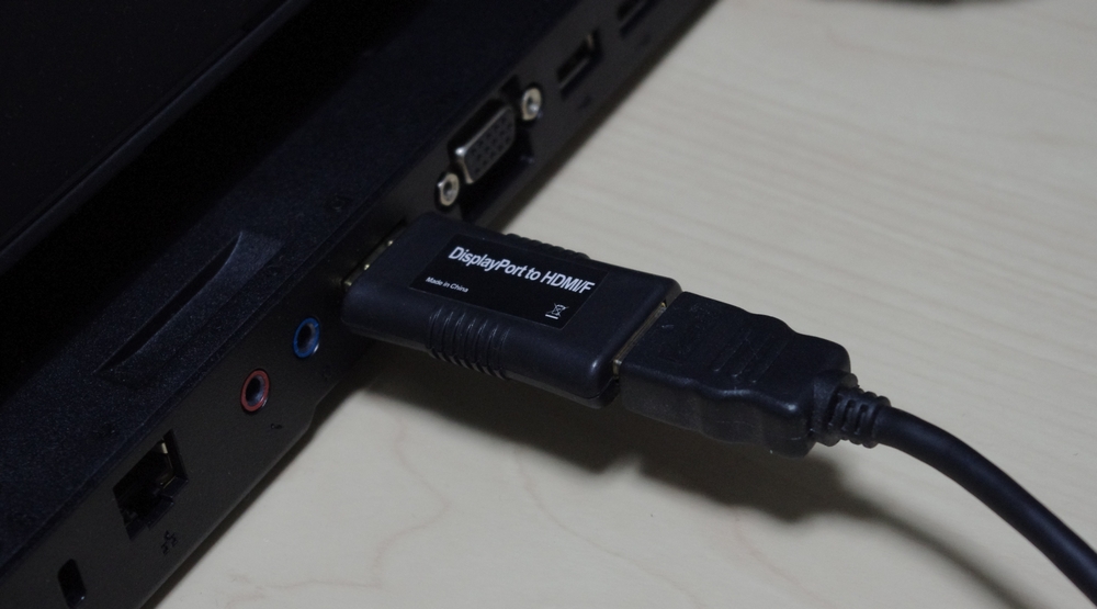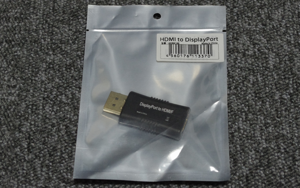 DisplayPort を HDMI に変換するコネクタです。各社色々出ていますが、サンコーレアモノショップのものが980円とリーズナブルな値段であったので、買ってみました。